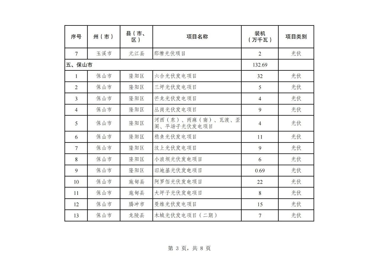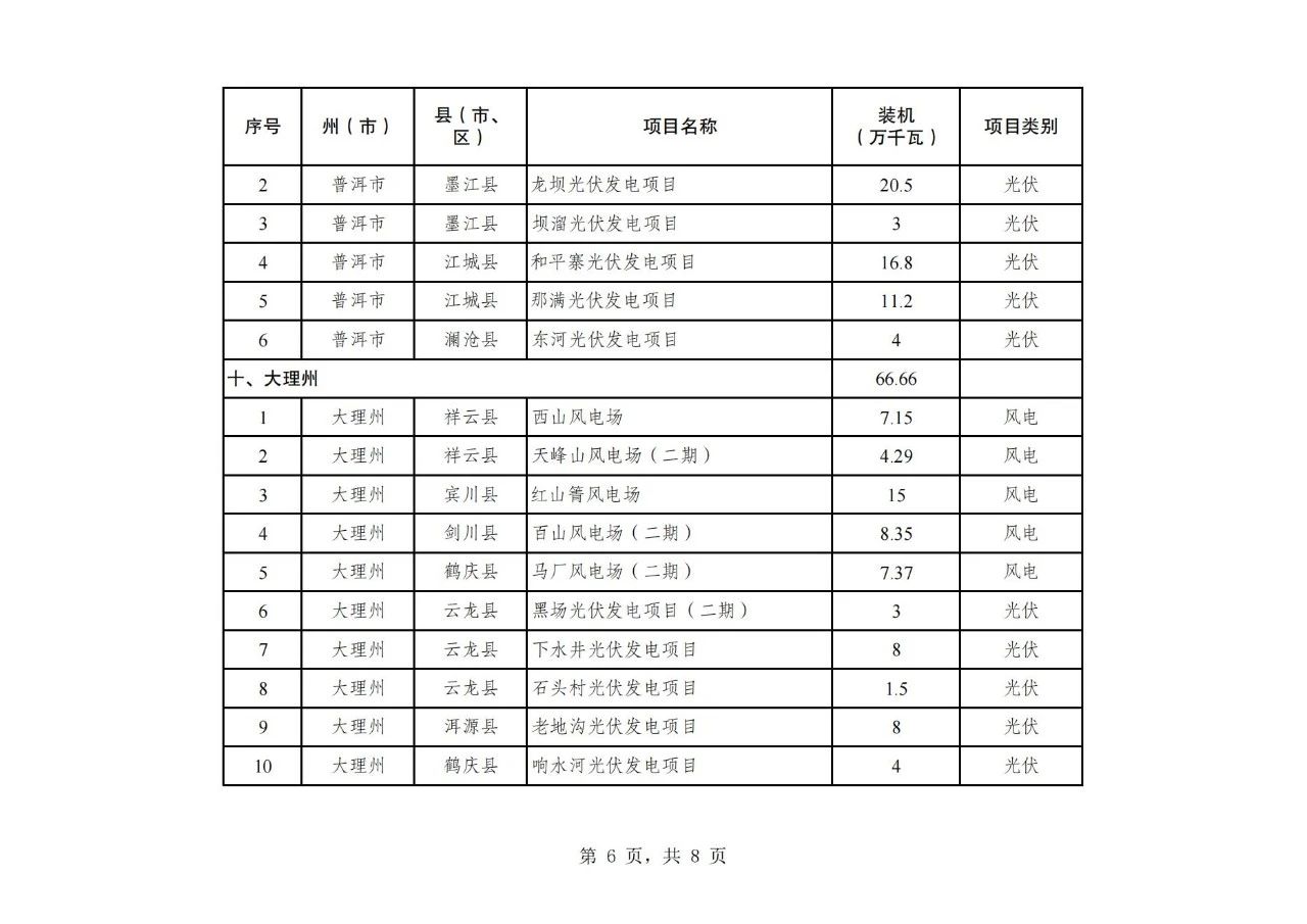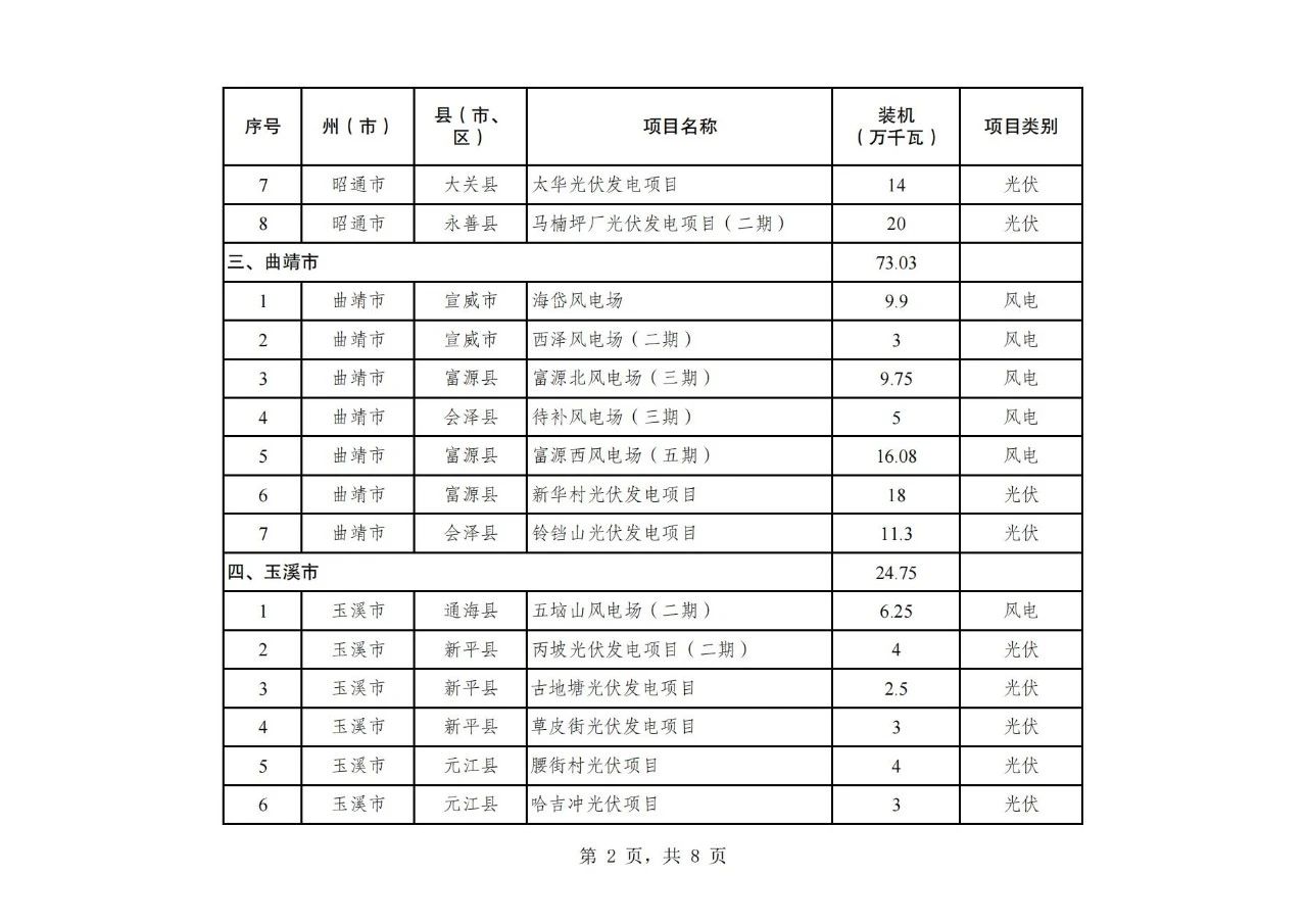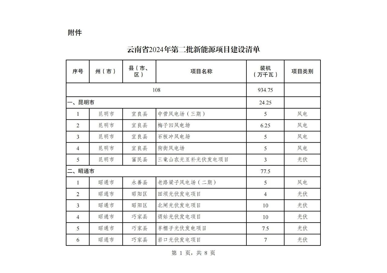纳入云南省2024年第二批新能源项目开发建设方案实施的项目共108个,装机934.75万千瓦,其中,风电项目30个、装机容量242.26万千瓦,光伏项目78个、装机容量692.49万千瓦(详见附件)。